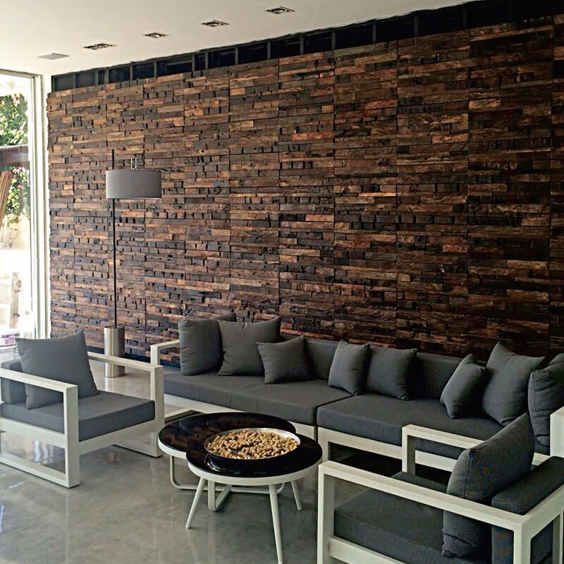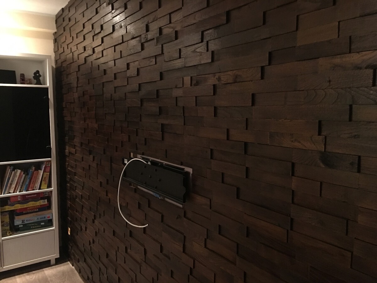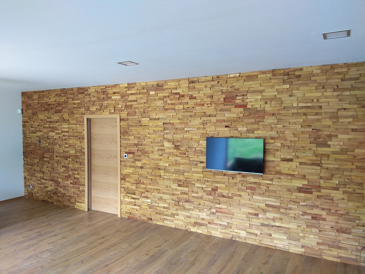 Akátová mozaika se skvěle hodí do každého interiéru jako obložení zdí, například v obývacím pokoji za televizí.