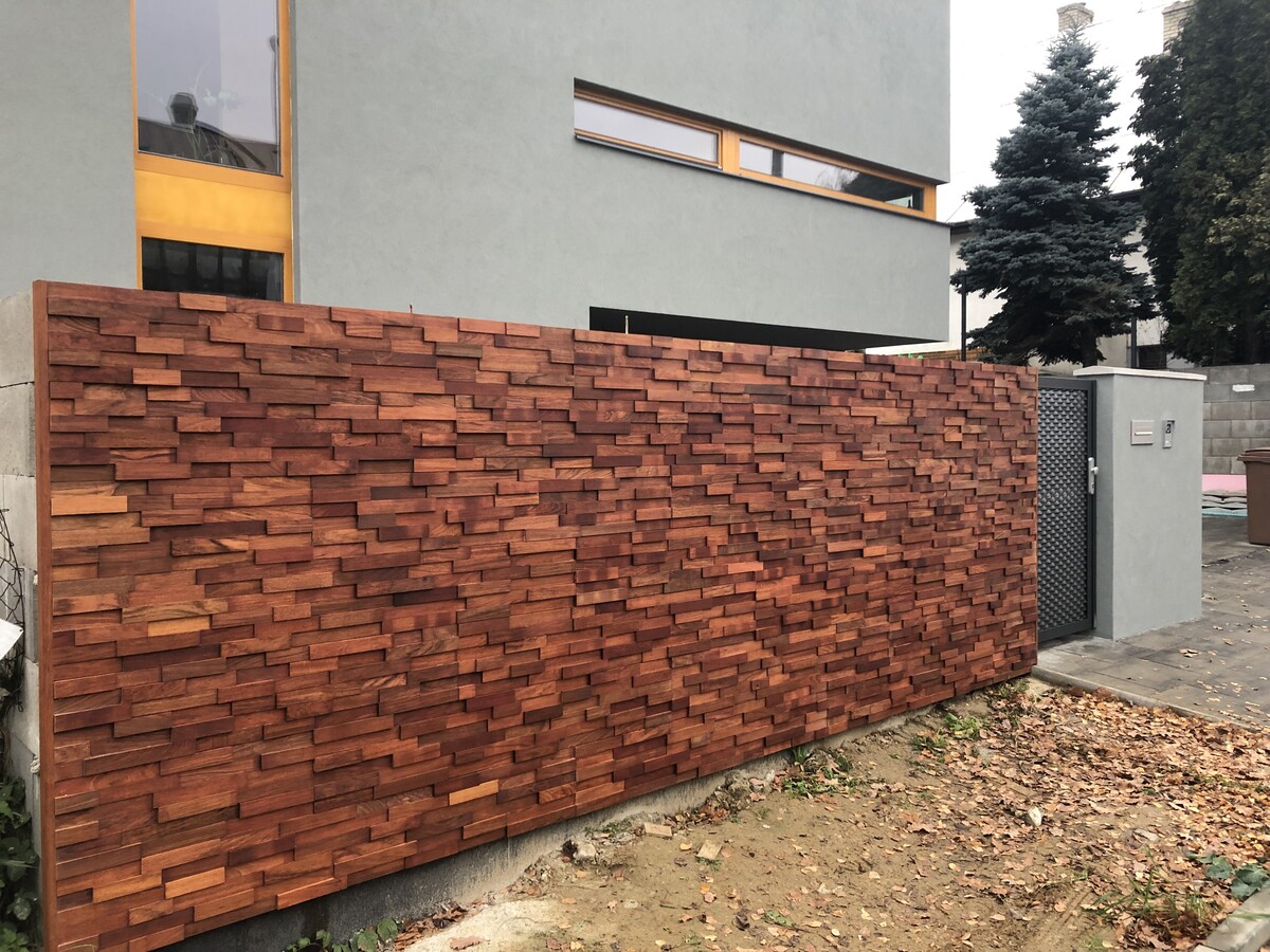Akátovou mozaiku můžete použít také jako venkovní obklad na fasádu, zeď nebo k obložení plotu.